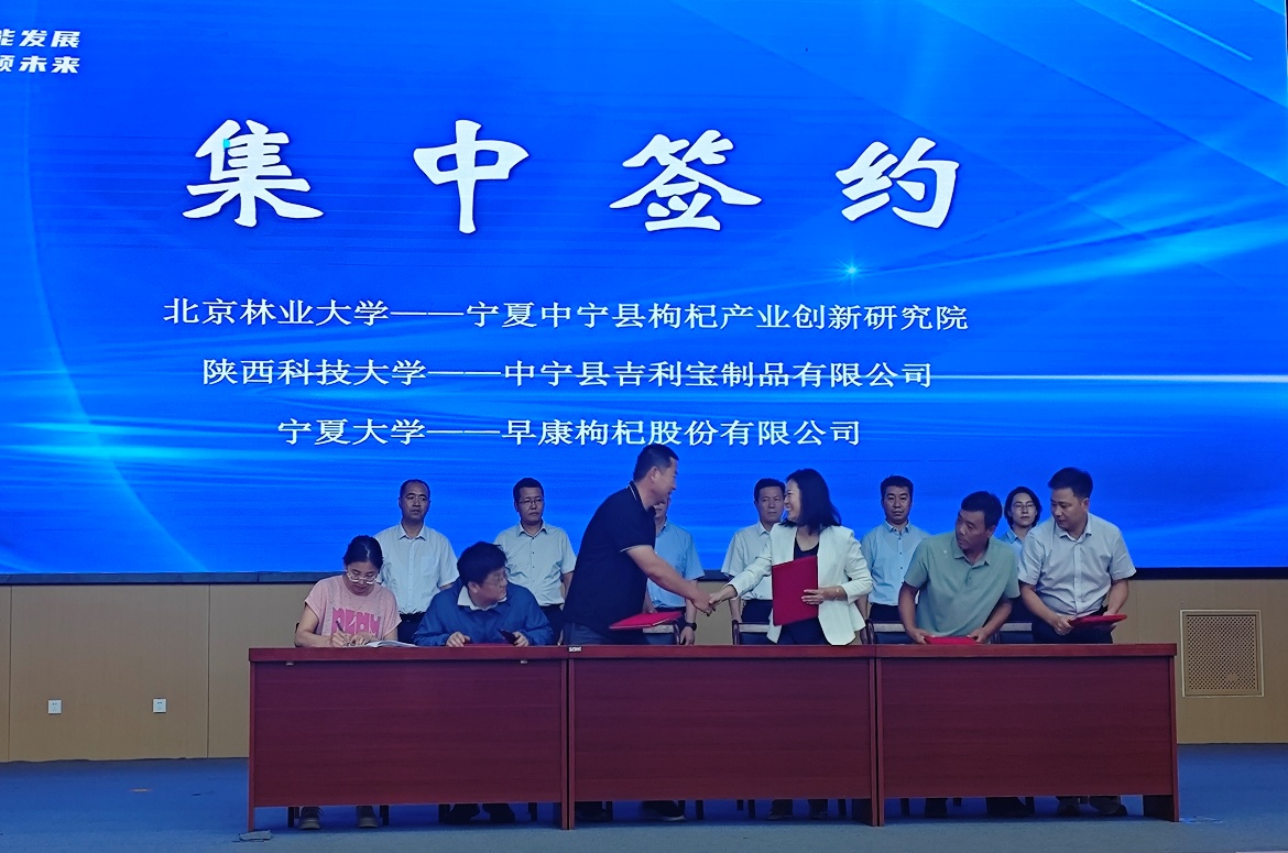 在随后的集中签约仪式上,食品科学与工程学院与早康枸杞股份有限公司正式签署“逆流切向模式超声强化枸杞制浆提质增效关键技术与应用”合作转化协议。此举标志着食品科学与工程学院该项科研成果成功落地中宁产业一线,将通过技术推广应用为当地枸杞制浆环节升级提供关键支撑,进一步推动中宁枸杞产业从传统加工向高效高质方向转型。