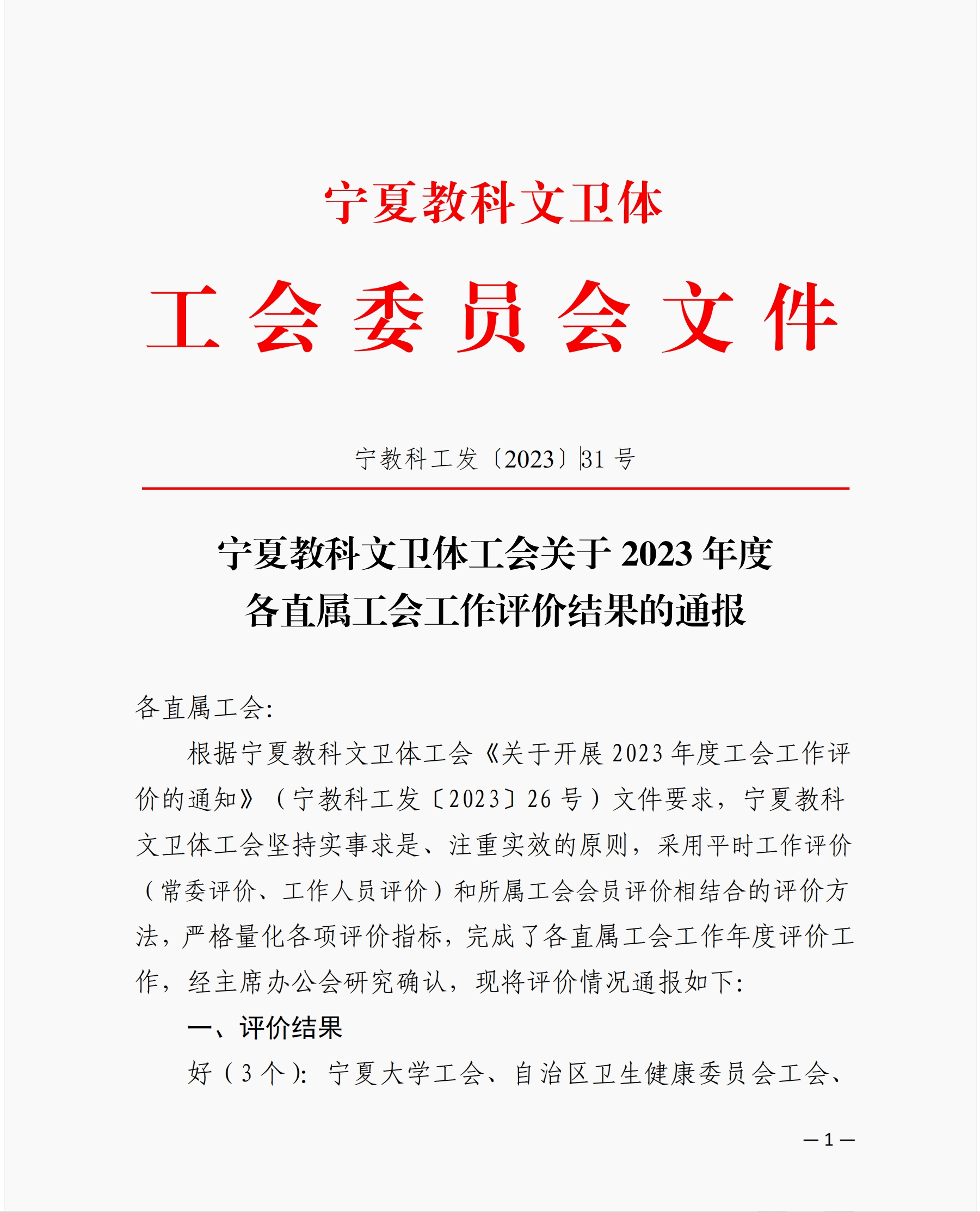 【beat365唯一官方网站新闻中心讯 工会】近日,beat365官网工会在宁夏教科文卫体系统28个直属工会开展的2023年度工作评价中连续第5年取得第一名的好成绩,并获得“好”的评价等次。宁夏教科文卫体工会坚持实事求是、注重实效的原则,采用平时工作评价(常委评价、工作人员评价)和所属工会会员评价相结合的方法,严格量化各项评价指标,对各直属工会的工作进行了年度综合评价,并对获得好、较好等次和本年度工作明显进步的直属工会进行通报表扬并...