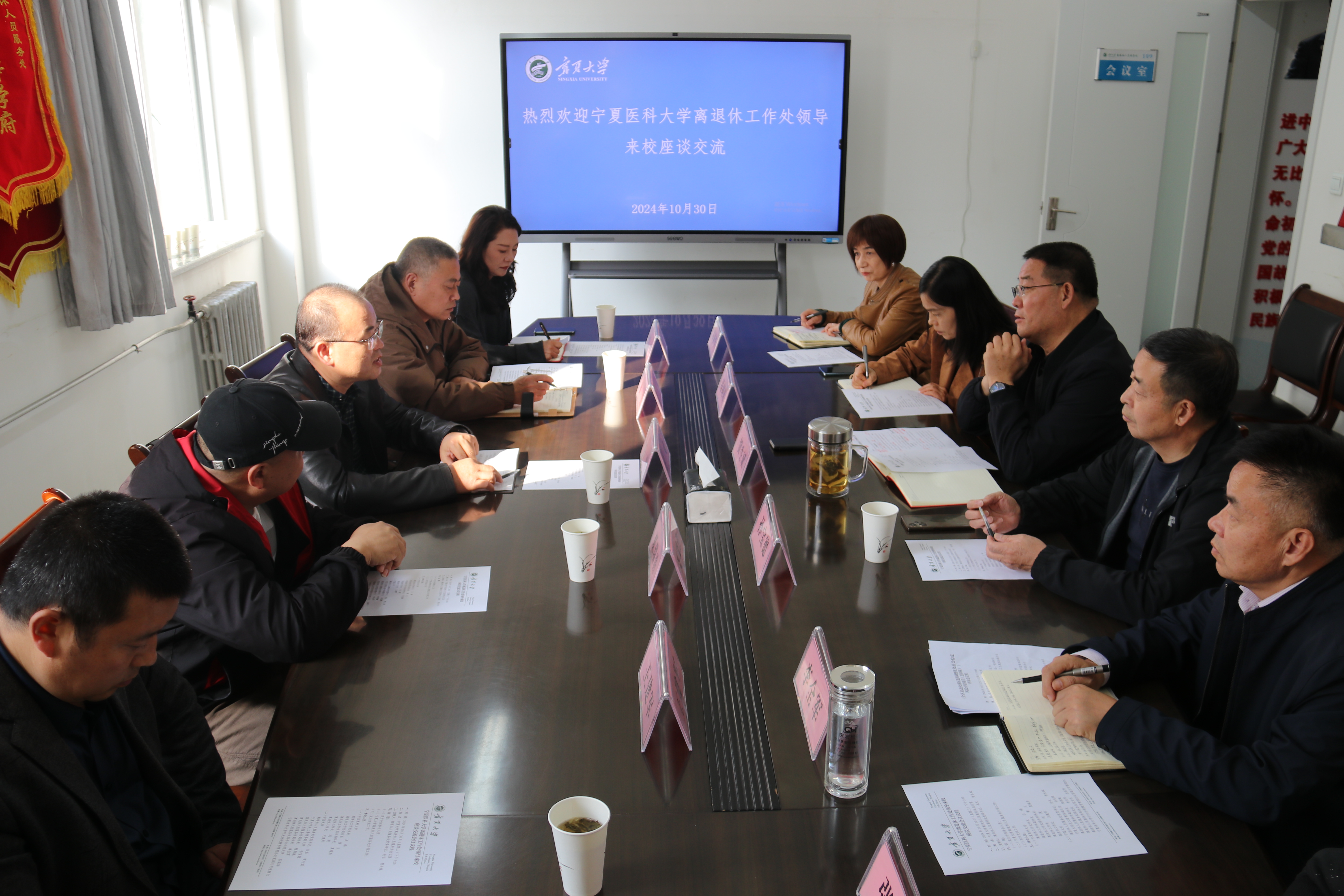 【beat365唯一官方网站新闻中心讯 离退休人员服务处】10月30日下午,宁夏医科大学离退休工作处处长王峰一行5人到学校离退休人员服务处调研交流离退休干部工作。处领导班子成员,关工委、老年大学分校、综合办公室等相关人员参加座谈交流。座谈会上,处党委书记、处长贺生斌对王峰一行表示欢迎,并介绍了beat365官网离退休干部工作的总体情况及关工委、老年大学分校建设发展的经验做法。王峰对beat365唯一官方网站离退休干部工作给予了充分肯定,并就宁夏医科...