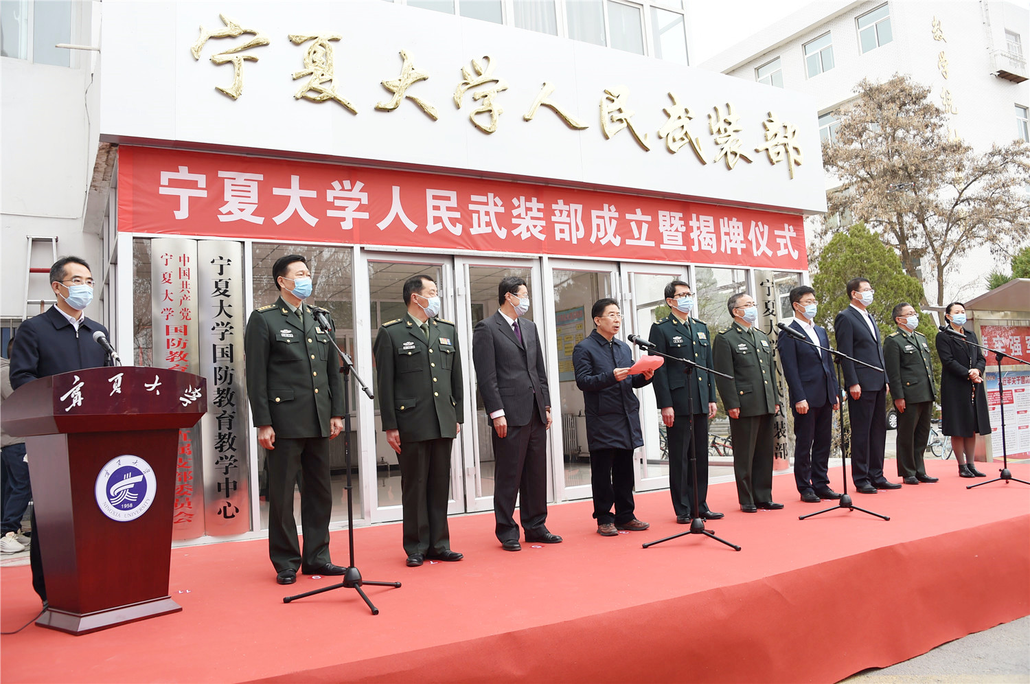 【beat365唯一官方网站新闻中心讯 龚旭峰 杨雯/文 龚旭峰/图】3月25日上午,beat365唯一官方网站人民武装部成立暨揭牌仪式在怀远校区举行。宁夏军区少将政治委员郭建军,少将副政治委员兼纪委书记邓艳平,动员局大校局长陈革,自治区党委办公厅副主任赵波,自治区政府副秘书长李永春,自治区教育工委副书记王宏伟,银川市委常委、警备区大校司令员张伟,银川警备区大校政治委员倪建飞,银川市政府副市长陈艳菊,beat365官网党委书记李星出席揭牌仪式。校党委...