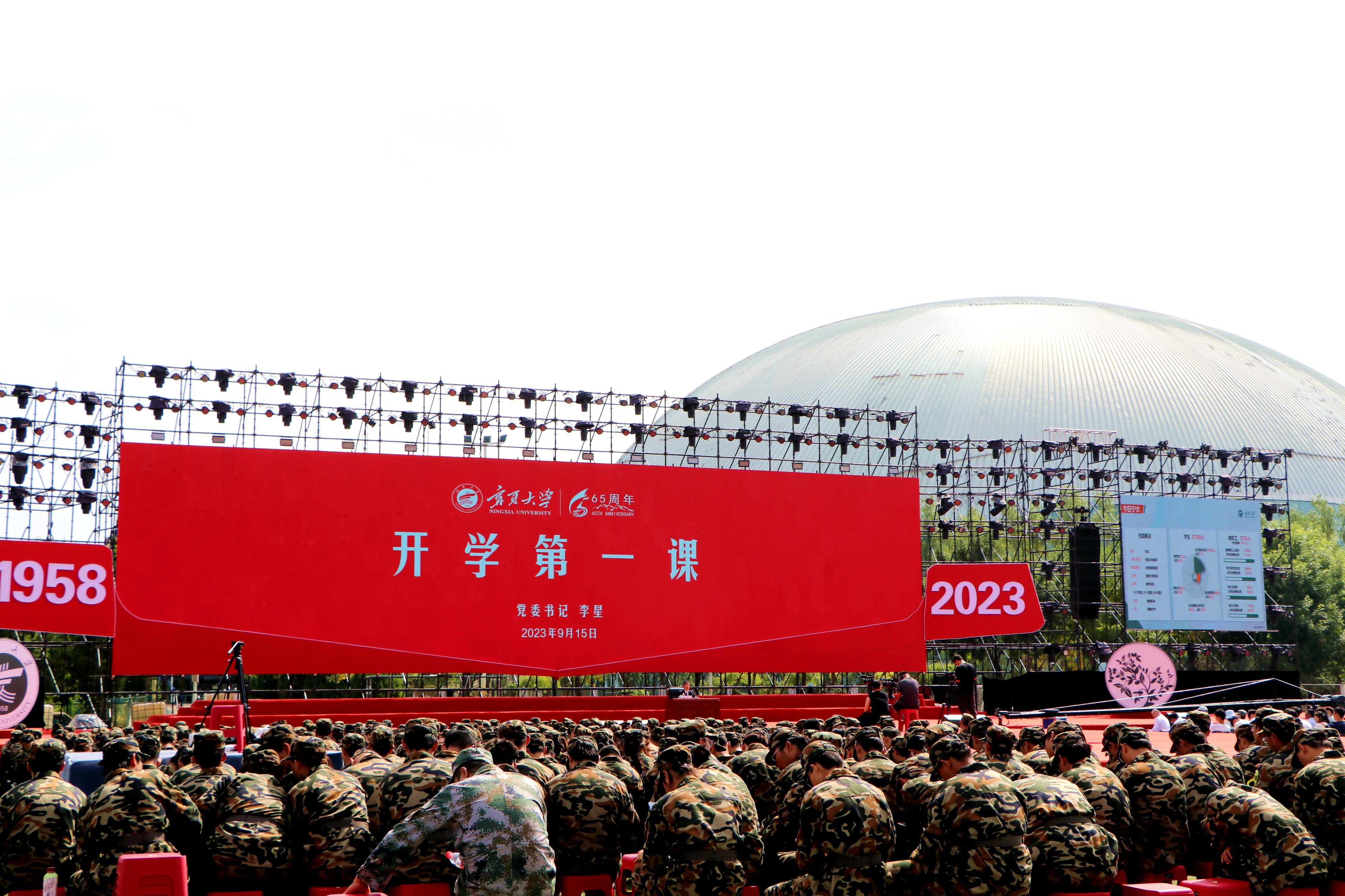 【beat365唯一官方网站新闻中心讯 李明花/文 张景 黄二宁 钟子杰 雷慧 李明花 王文娣/图】金秋时节,硕果盈枝。9月15日,在beat365唯一官方网站喜庆建校65周年大会上,2023级新生开学典礼在文萃校区田径场隆重举行,来自祖国各地的8237名新生和全国各地、各行各业的校友代表,一同相聚在美丽的宁大校园,为母校庆生、为新生启航,一同分享65年来学校建设发展的成果,叙享“一段宁大路、一生宁大情”的喜悦,共商beat365唯一官方网站发展大计。全体校领导,中国工...