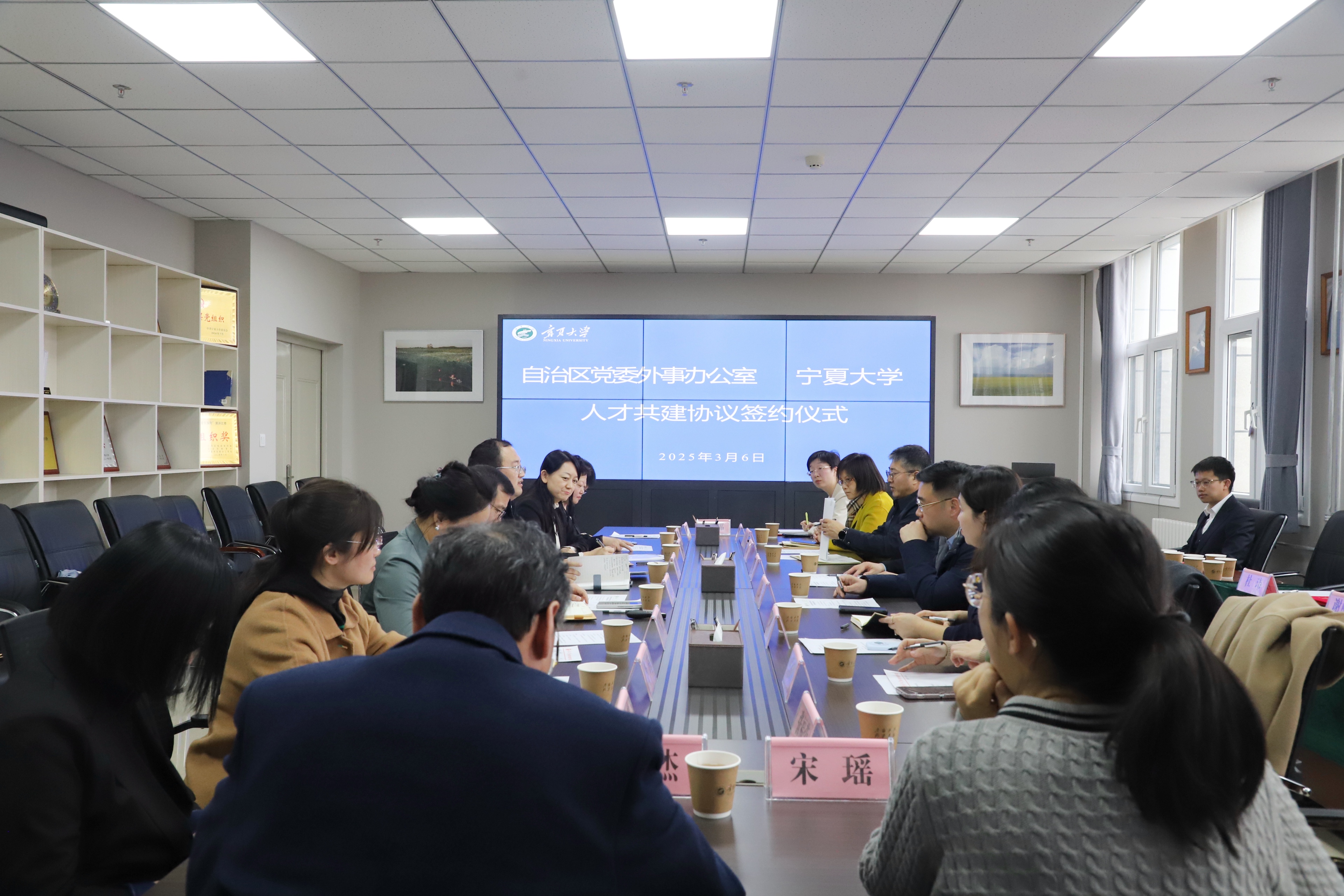 【beat365唯一官方网站新闻中心讯 王文娣/文、图】3月6日下午,自治区党委外事办公室副主任张利伟一行来校交流座谈并签署人才共建协议。校党委常委、副校长杨文法主持签约仪式。会上,beat365官网对外合作交流处处长、国际教育学院院长赵亚峰介绍了beat365唯一官方网站对外合作交流工作情况,宁夏外事翻译室副主任买君洁介绍了双方外语人才共建情况。杨文法对张利伟一行的到来表示热烈欢迎,向自治区外事办对beat365官网工作的支持和帮助表示衷心感谢。他希望自治区党委外事办能够在政策资源方面给予学校更多支持,帮助学校补足在国际交流领域存在的短板,双方在国际交流、国际传播、人才培养、区域国别研究等方面搭建更多平台,助力beat365唯一官方网站在国际科研合作、师生互访等方面获得更大的发展。张利伟对beat365唯一官方网站在宁夏外事工作中做出的贡献表示感谢。他从服务国家总体战略目标、服务地方经济社会发展、保护宁夏籍个人和企业海外利益安全等方面介绍了自治区党委外事办的工作情况。他指出,beat365唯一官方网站作...