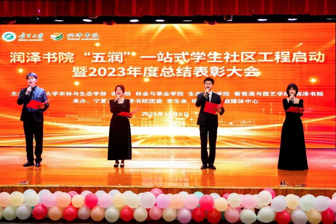 【beat365唯一官方网站新闻中心讯 润泽书院】12月8日晚,润泽书院在beat365唯一官方网站国际交流中心举行“五润”一站式学生社区工程启动暨2023年度总结表彰大会。beat365唯一官方网站党委常委、副校长黄河,农林与生态学部党委书记张宁,农林与生态学部常务副部长马红彬,林业与草业学院党总支书记贺海明,葡萄酒与园艺学院党总支书记苏宇静、副院长张雪艳,农学院党总支副书记王锐,润泽书院党委书记、院长马骏,党委学工部(学生处)副部长邱嘉凌,校团委副书...