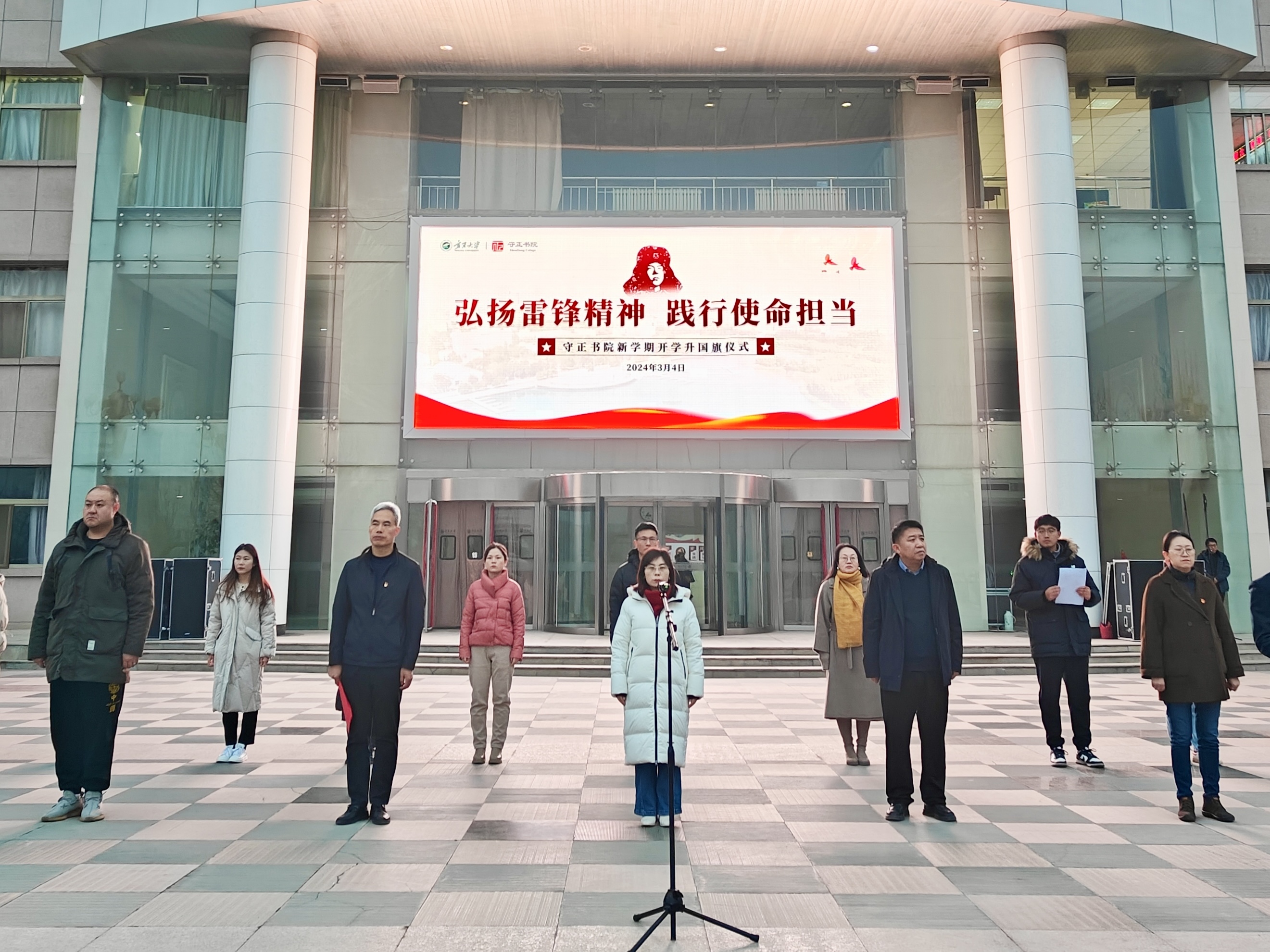 【beat365唯一官方网站新闻中心讯 守正书院】新学期开启新征程,新目标激发新动力。3月4日清晨,守正书院在贺兰山校区德勤楼前举行以“弘扬雷锋精神 践行使命担当”为主题的庆祝新中国成立75周年——学雷锋纪念日开学升国旗仪式。书院领导班子成员、全体辅导员及各年级学生代表参加升国旗仪式。仪式由书院党委副书记何文栋主持。7时20分,升国旗仪式正式开始。国旗护卫队迈着整齐划一的步伐,在铿锵有力的脚步声中护卫着五星红旗入场。伴着庄严嘹亮的国歌声,在师生的庄严注视下,五星红旗缓缓升起,在熠熠晨光中迎风飘扬。2021级阿拉伯语专业学生祁弋琳作为本科生代表发言,她号召同学们以雷锋精神为引领,把雷锋精神和志愿服务精神融入日常,用奉献与无私、汗水与拼搏担负起国家建设、民族复兴的使命;2022级民族社会学专业学生马程浩作为研究生代表发言,他从“铭记历史,不忘初心”“学习雷锋,无私奉献”以及“展望未来,砥砺奋进”三个方面号召同学们以更加昂扬的...