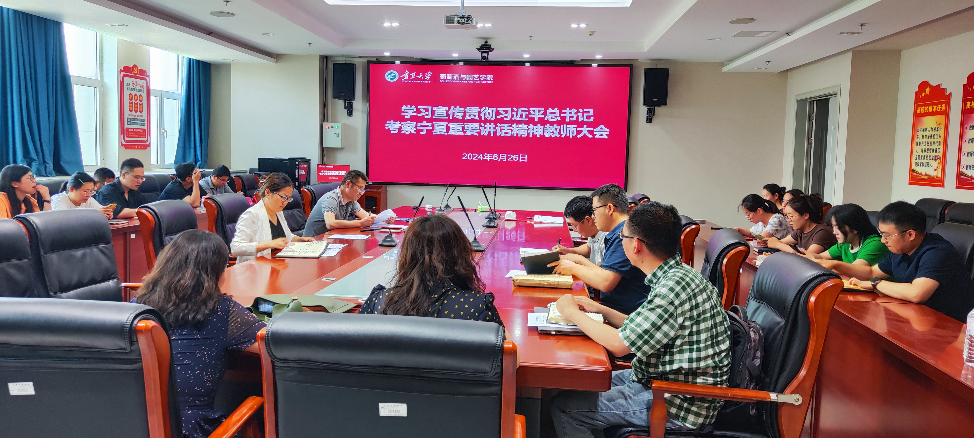 【beat365唯一官方网站新闻中心讯 葡萄酒与园艺学院】6月26日下午,葡萄酒与园艺学院召开学习宣传贯彻习近平总书记考察宁夏重要讲话精神教师大会。全体在校教师参加会议,学院党总支书记苏宇静主持会议。会议传达学习了习近平总书记考察宁夏重要讲话精神,组织学习了高校违纪违法典型案例。会议强调,全院要把学习好、宣传好、贯彻好习近平总书记考察宁夏重要讲话精神作为首要政治任务,各党支部要认真组织党员教师围绕学院高质量发展展...