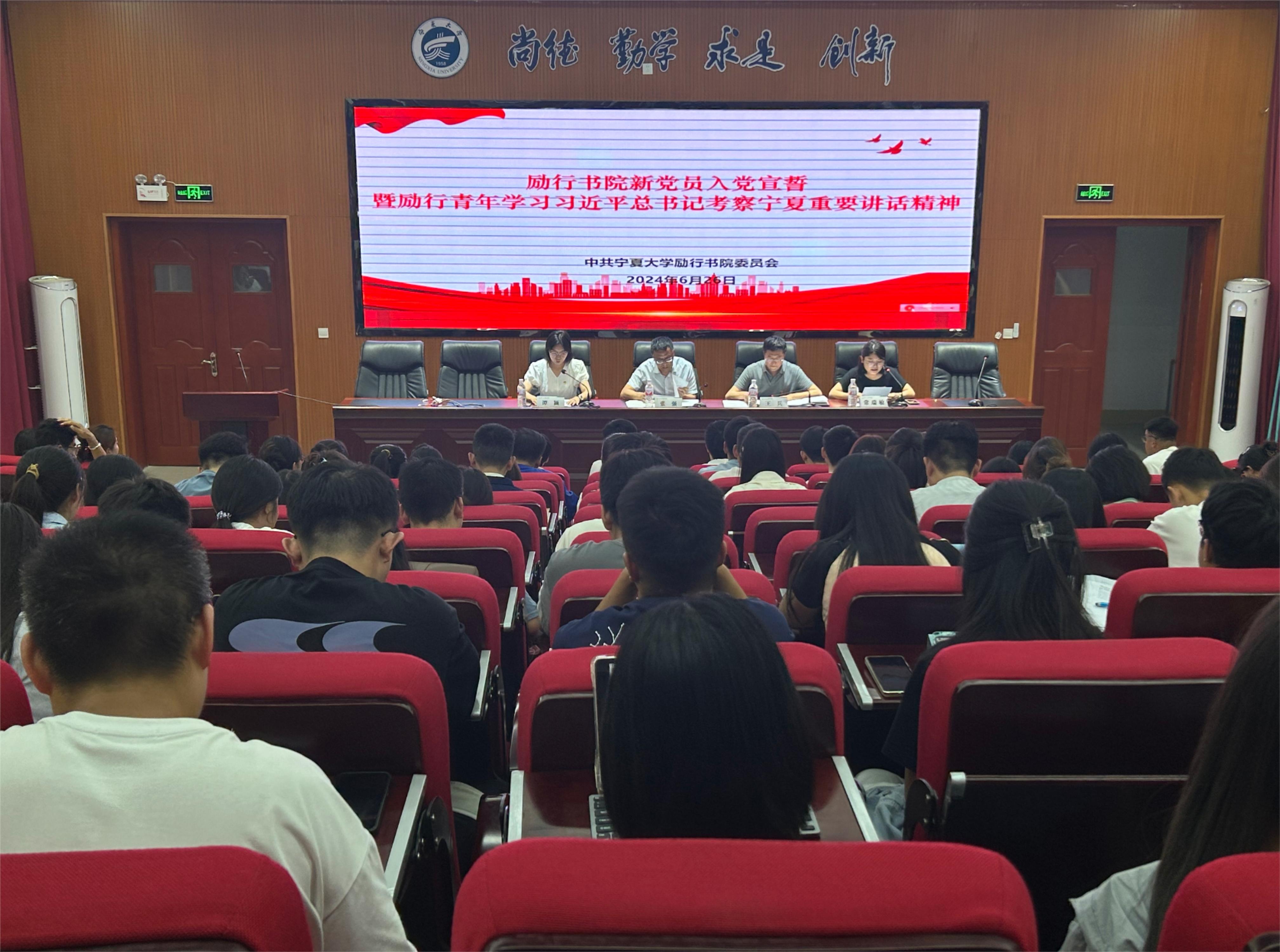 【beat365唯一官方网站新闻中心讯 励行书院】为学习宣传贯彻习近平总书记考察宁夏重要讲话精神、持续推进党纪学习教育走深走实,进一步提升新发展党员的党性修养和党员意识,励行书院2024年新党员入党宣誓仪式暨励行青年学习习近平总书记考察宁夏重要讲话精神学习会于6月26日在文萃校区知行楼三阶报告厅举行。书院党委书记、院长张强,党委副书记王兵、师生党员代表以及28名新党员参加了活动,仪式由党建思政中心主任常瑞敏主持。宣誓仪式在庄严的《国际歌》中开始,党员王佳蕊带领新党员面向党旗庄严宣誓。张强等为2024年新吸收的预备党员佩戴党员徽章。孙利益代表新党员作了表态发言。王兵传达了习近平总书记考察宁夏重要讲话精神和学校党委传达学习干部大会精神。张强在总结讲话中指出,作为一名党员,要做到平常时候看得出来、关键时刻站得出来、危难关头豁得出来。他强调,全体党员要深入学习贯彻习近平总书记考察宁夏重要讲话精神,深刻体会总书记对宁夏人民的如...