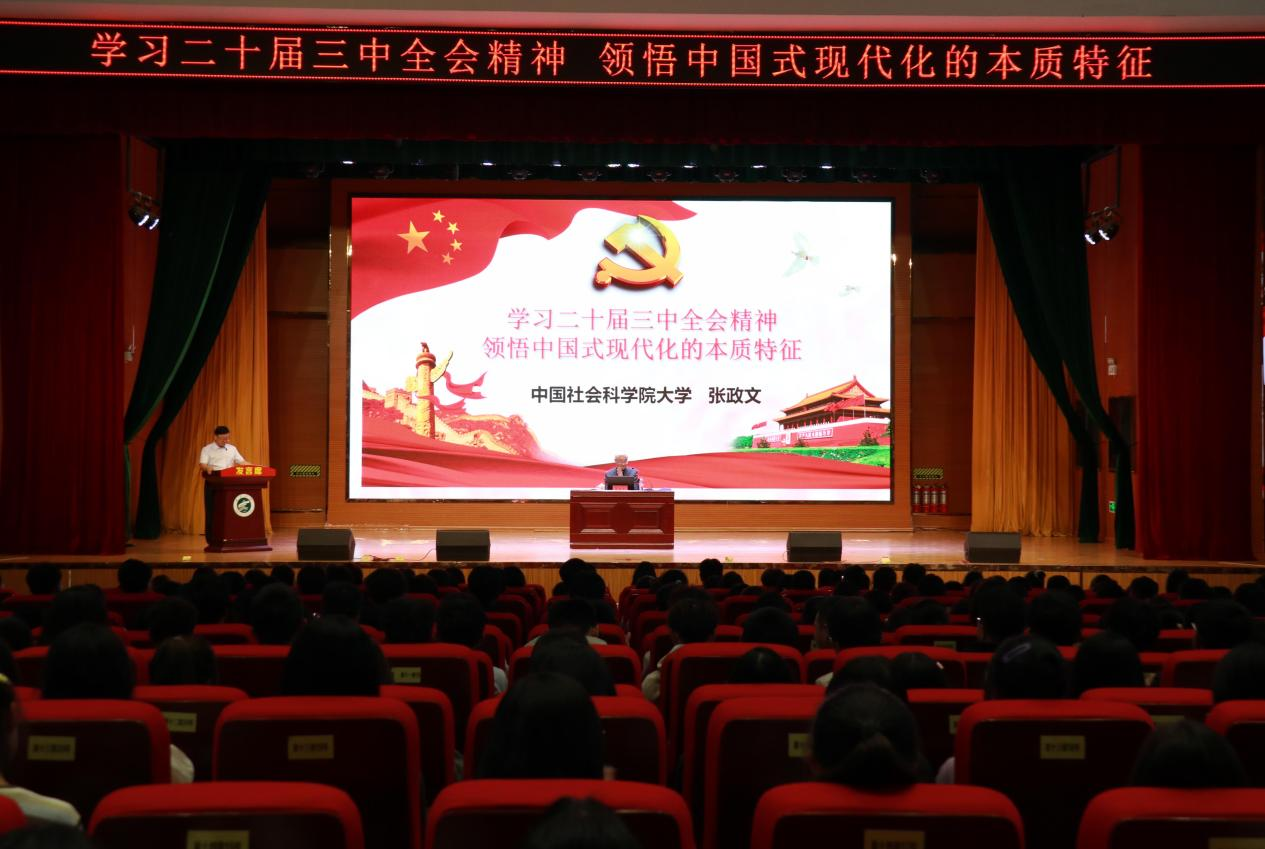 【beat365唯一官方网站新闻中心讯 博雅书院】为深入学习党的二十届三中全会精神,深刻理解中国式现代化的本质特征,9月12日,中国社会科学院大学校长、党委常务副书记张政文为中卫校区师生作了“学习党的二十届三中全会精神 领悟中国式现代化的本质特征”专题讲座,校党委常委、副校长黄河主持报告,校区部分老师、学生党员和2024级新生聆听了讲座。张政文通过旁征博引、中西对比、举例论证等形式,讲解了现代化国家和传统社会的基本特征,梳理了中国式现代化的发展脉络,阐释了中国式现代化的本质特征,对比了中国式现代化与西方现代化的巨大差异,指出中国式现代化道路是一条崭新的社会主义现代化新道路。黄河表示,讲座是一堂深刻的思想政治理论课,也是一堂生动的爱国主义教育课,对于校区师生更加全面、深入理解党的二十届三中全会精神,增强中国式现代化的信心和决心,把思想和行动自觉统一到现代化强国建设和民族复兴伟业的伟大实践中具有重要的激励促进作用。他...