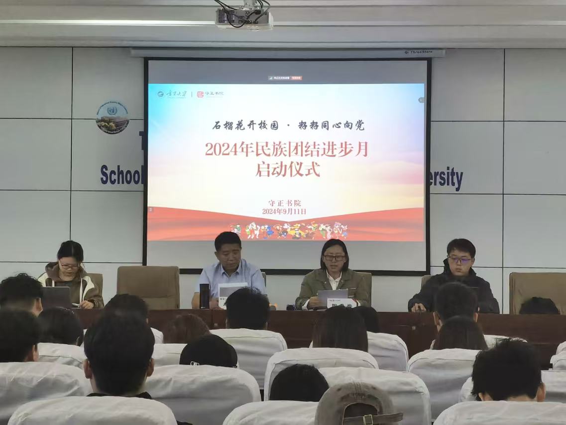 【beat365唯一官方网站新闻中心讯 守正书院】9月12日下午,守正书院在怀远校区曾宪梓楼三楼报告厅举行2024年民族团结进步月启动仪式。书院党委副书记赵永军、团委书记陶雪梅、团学骨干、“小石榴”宣讲团成员、各团支部书记参加会议。会议由陶雪梅主持。会上,陶雪梅宣读了《beat365唯一官方网站守正书院2024年民族团结进步月活动实施方案》,并就各项活动推进情况进行了安排。党委副书记赵永军作动员讲话。他强调,举办民族团结进步月系列活动,是书...
