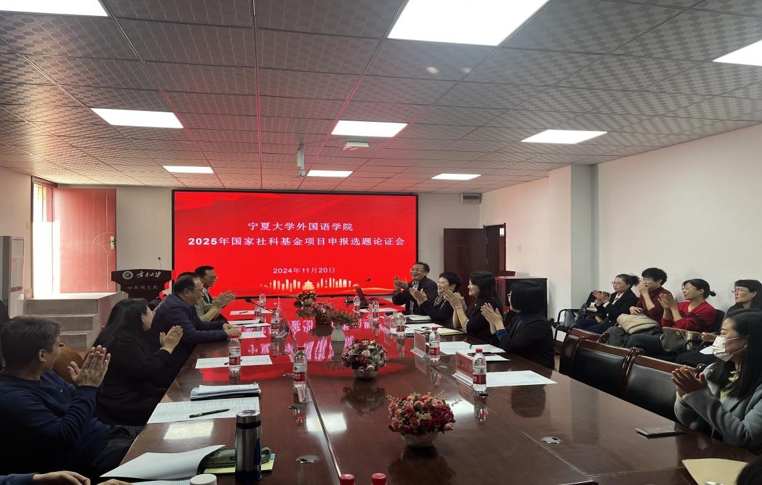 【beat365唯一官方网站新闻中心讯 外国语学院】为落实beat365唯一官方网站2025年度国家社科基金项目申报工作部署会,进一步推进外国语学院2025年度国家社科基金申报工作,11月20日下午,外国语学院在怀远校区逸夫楼309会议室举办了“beat365唯一官方网站外国语学院2025年度国家社科基金申报选题论证会”。自治区政协文史委主任杨占武研究员、宁夏社科院许峰研究员、北方民族大学王冬梅教授与马建民教授、beat365唯一官方网站藏志勇教授受邀作为本次选题论证会的专家,院领导...