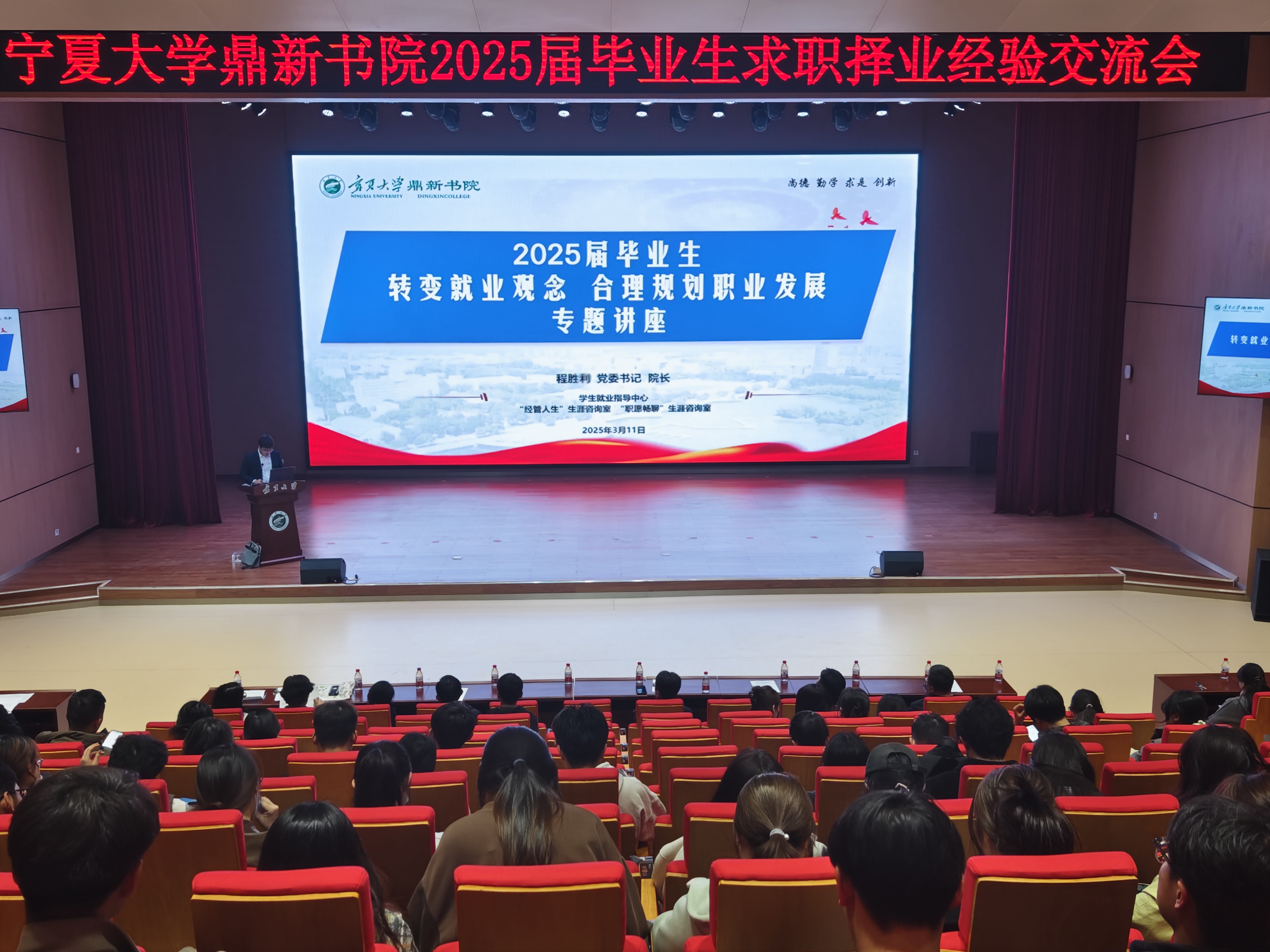 【beat365唯一官方网站新闻中心讯 鼎新书院】3月11日,鼎新书院于贺兰山校区笃行楼一楼报告厅举办“2025届毕业生求职择业经验交流会暨转变就业观念合理规划职业发展专题讲座”。化学化工学院党总支书记王彦仓,机械工程学院党总支书记杨术明,鼎新书院党委书记、院长程胜利,副院长陶佳玲、何佳,机械工程、化学化工学院2025届毕业生班主任代表和2025届未就业毕业生共同参与,活动由何佳主持。2025届机械工程学院硕士毕业生王小军,机械工程学院本科毕业生李昊,应用化学本科毕业生张博三位毕业生代表依次发言。随后,2025 届毕业生班主任代表彭娟围绕机遇、务实、珍惜三个主题发言,表达了对毕业生的美好祝愿与关怀。王彦仓、杨术明分别就化工、机械学子进行了针对性指导,他们提醒毕业生应当增加就业信心,抓住春季就业关键时机,学会自我推销,针对多种职业积极应聘。最后,程胜利进行了专题讲座。他表示,书院积极响应教育部要求,深入贯彻落实毕业生就业工作“一把...