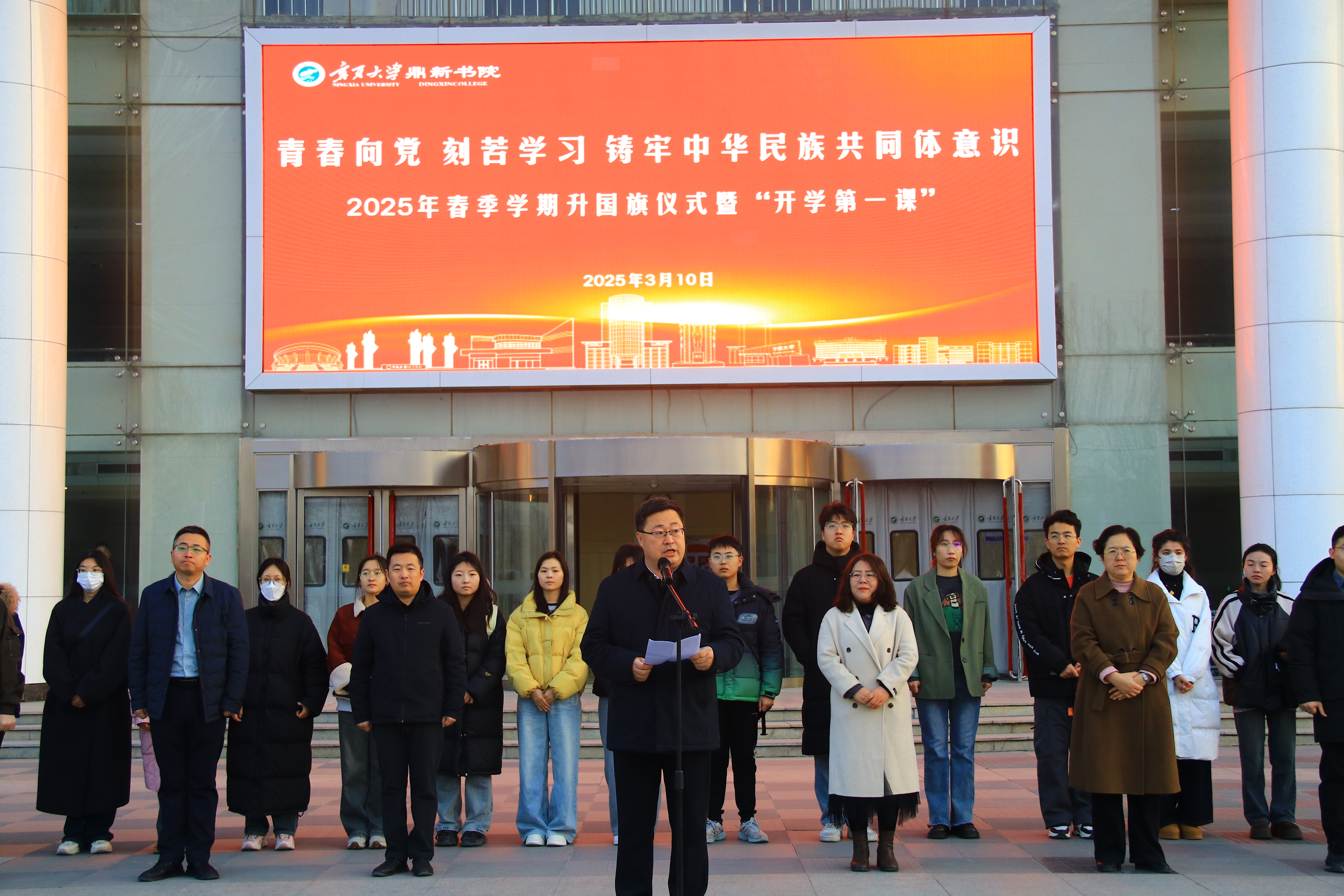 【beat365唯一官方网站新闻中心讯 鼎新书院】3月10日上午,鼎新书院在德勤楼前举行2025年春季学期升国旗仪式暨“开学第一课”,书院党委书记、院长程胜利,副书记马丽蓉、黄旭兴,副院长陶佳玲、何佳,全体辅导员及书院三千余名同学参加仪式。在庄严的国歌声中,五星红旗缓缓升起。学生代表2022级化学师范班孙婷玉作了《我心向党,奔赴远方》国旗下的演讲,随后学生代表合唱歌曲《我相信》。班主任代表李建涛从责任、传承、成长三个方面进行发言,希望同学们敢于创新、不怕困难,能够在自己擅长的领域大放异彩。程胜利讲授开学第一课。 他对书院上学期的工作做了总结并对同学们在期末考试中取得的优异成绩和展现出的良好风貌表示肯定。他鼓励同学们要珍惜大学时光,勤奋学习、勇于探索、追求卓越,要尊重各民族文化,铸牢中华民族共同体意识,坚决抵制校园宗教渗透,严禁在校园内传播宗教和进行宗教活动。(责任编辑:王文娣