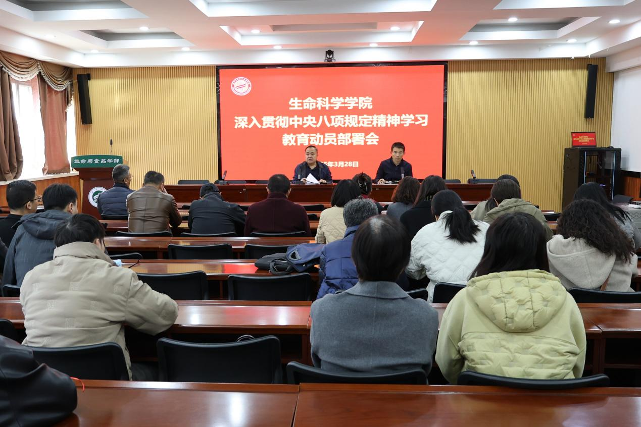 【beat365唯一官方网站新闻中心讯 生命科学学院】为扎实开展深入贯彻中央八项规定精神学习教育,进一步加强学院党风廉政建设,推动全面从严治党向纵深发展,生命科学学院于3月28日召开深入贯彻中央八项规定精神学习教育部署会。学院全体党员参加,会议由学院党总支书记邓光存主持。会上,生命与食品学部党委副书记、副部长蔡正云传达学习了自治区《关于在全区开展深入贯彻中央八项规定精神学习教育的实施方案》、beat365唯一官方网站《关于深入贯彻中央八项规定精神学习教育的工作提示》等文件。邓光存详细解读了深入贯彻中央八项规定精神学习教育的主要内容和精神实质,并安排部署了学院深入贯彻中央八项规定精神学习教育工作,作了警示教育案例剖析。他指出,学习中央八项规定精神是新时代全面从严治党的重要抓手,是党员干部廉洁自律的行为准则,学习中央八项规定精神是当前和今后一个时期学院党建的重要政治任务,全体党员要以高度的政治责任感和使命感,认真学习贯彻中央八项...